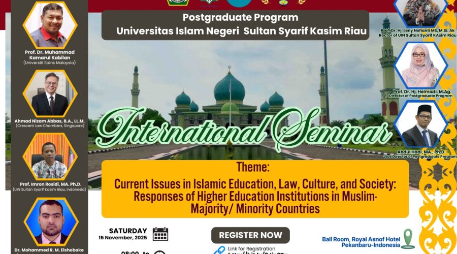 https://mtbi.pasca.uin-suska.ac.id/wp-content/uploads/2025/11/Seminter.mp4 Pekanbaru, 15 November 2025 — Program Pascasarjana Universitas Islam Negeri (UIN) Sultan Syarif Kasim Riau sukses menyelenggarakan International Seminar bertema “Current Issues in Islamic Education, Law, Culture, and Society: Responses of Higher Education Institutions in Muslim-Majority/Minority Countries.” Acara bergengsi yang diadakan pada hari Sabtu, 15 November 2025, di Ball Room, Royal Asnof Hotel Pekanbaru-Indonesia ini, mendapat sambutan antusias dari ratusan peserta. Seminar ini dihadiri oleh mahasiswa dari berbagai program...